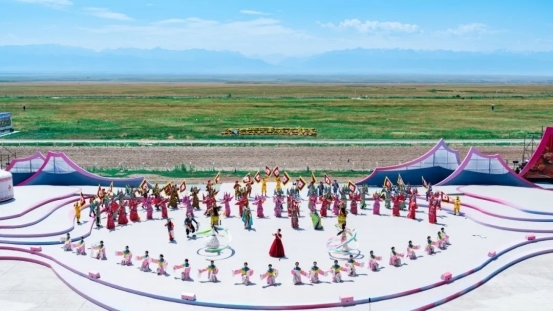 2025’新疆伊犁天馬文化旅游節(jié)開(kāi)幕式舞臺(tái)以巍峨的天山和遼闊的草原為背景,文藝演出由“蹄印千年·絲路新顏”、“蹄印千年·絲路新韻”、“蹄印千年·絲路新潮”三大篇章及尾篇組成。開(kāi)幕式文藝演出在開(kāi)場(chǎng)歌舞《團(tuán)結(jié)一心襄盛會(huì)》中拉開(kāi)序幕,展現(xiàn)了各族群眾團(tuán)結(jié)奮進(jìn)、銳意進(jìn)取的精神風(fēng)貌。