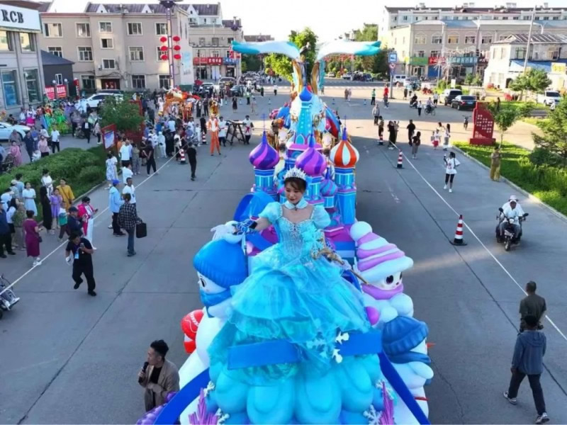 巡游隊伍中,47名專業(yè)演員的表演同樣精彩紛呈。“金翎飛霄”方陣的男演員們身著女真武士鎧甲,手持長矛跳起剛勁有力的戰(zhàn)舞;“鐘林毓秀”方陣的女演員則化身森林精靈,輕盈的舞步配合著花車上搖曳的藍莓枝椏,演繹出林間仙境的唯美畫面。演員們還不時走下花車與觀眾互動,教小朋友模仿鄂倫春族的傳統(tǒng)舞蹈動作,現場笑聲不斷。