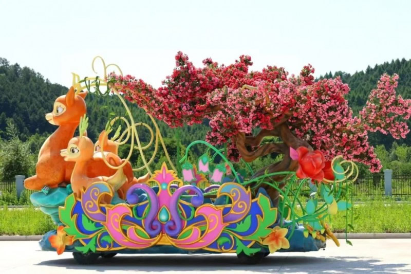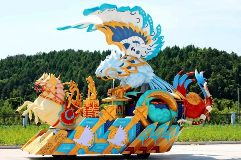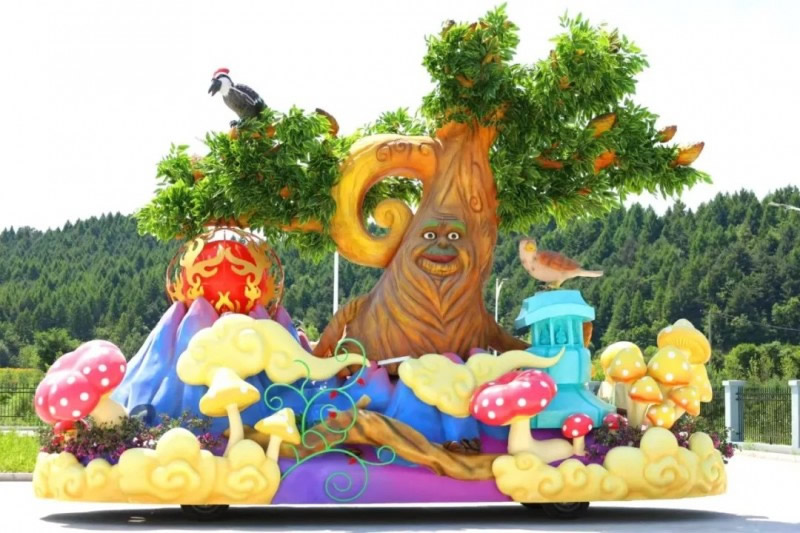 花車設計不僅注重視覺沖擊力,更融入動態(tài)特效:虎頭擺動、翅膀扇動、雪花機噴灑等細節(jié),讓靜態(tài)的造型煥發(fā)生命力。夜幕降臨時,花車更以夜光效果點亮林海,為觀眾呈現一場光影交織的奇幻盛宴。