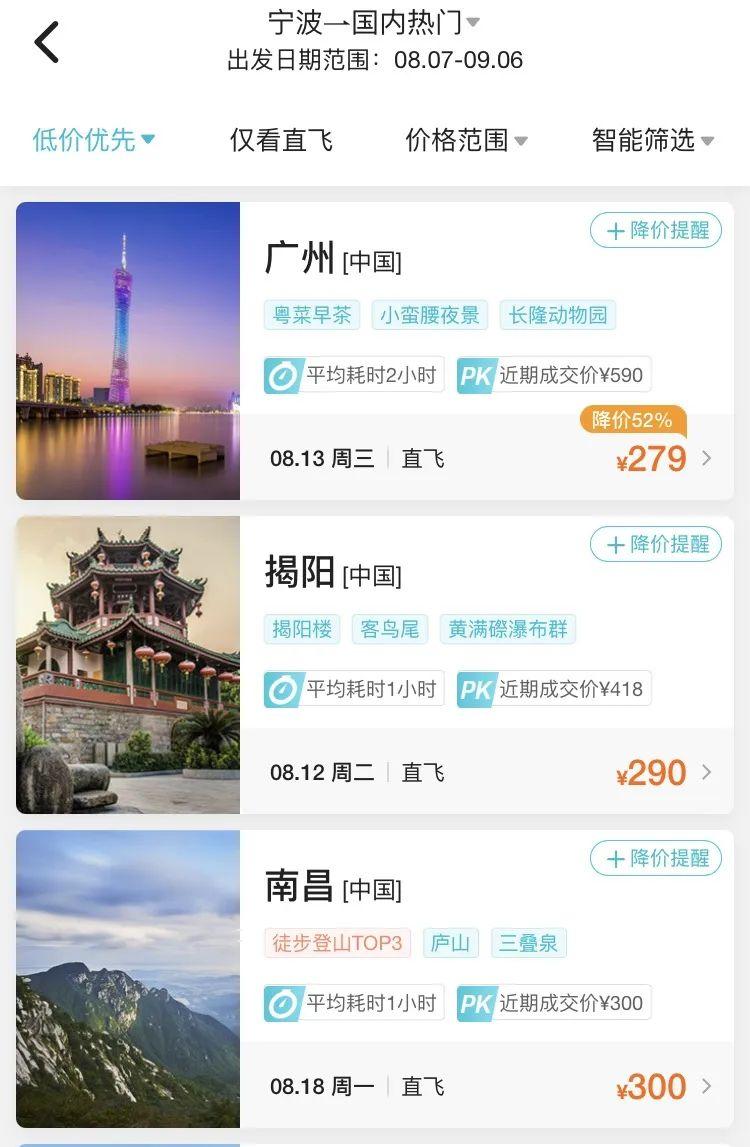 8月中旬,寧波飛廣州、揭陽的機(jī)票價格2字頭就可拿下,比如8月13日寧波飛廣州最低票價僅需279元(不含稅),8月12日寧波直飛揭陽機(jī)票價格最低僅需290元(不含稅)。