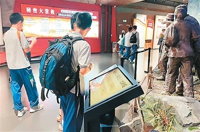 游客步入館內(nèi),仿佛踏入歷史的洪流。全息投影、文物陳列、場景復原等技術打造出數(shù)字化展陳空間。曾經(jīng)只能在文字和圖片中描繪的歷史場景,如今栩栩如生地呈現(xiàn)在眼前。在秘密大營救展區(qū),雕塑還原文化名人在游擊隊員護送下離開的場景,當觀眾點擊多媒體互動裝置選擇不同的撤退路線時,大屏幕會動態(tài)還原當時驚險的轉(zhuǎn)移路徑,讓人如同身在其中,真切感受到革命先輩在槍林彈雨中的英勇機智。來自廣州的黃同學說:“有了這些多媒體設備,讓我更直觀了解到當時槍林彈雨的危險場景,也更好地學習了東江縱隊的歷史。”