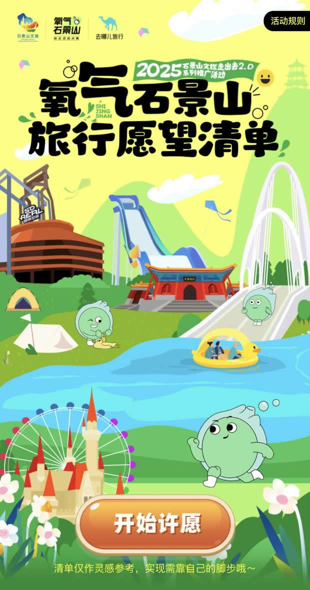 在“去哪兒”旅行APP上線“氧氣石景山”文旅專題頁,不僅整合酒店榜單、景區(qū)門票、優(yōu)質(zhì)攻略等核心文旅資源,更特別設(shè)置石景山區(qū)對口支援和協(xié)作地文旅產(chǎn)品版塊,實現(xiàn)“石景山推廣+支援地區(qū)助銷”雙重價值。同步推出的“旅行打卡愿望清單”H5,線上用戶可點亮自己的石景山旅游心愿,生成專屬旅行愿望清單;在高校路演活動中,大學生可分享H5到社交媒體作為參與活動的入場券——既為高校活動預熱,更成為高校路演入場憑證,串聯(lián)起“線上互動-線下參與”的閉環(huán)。