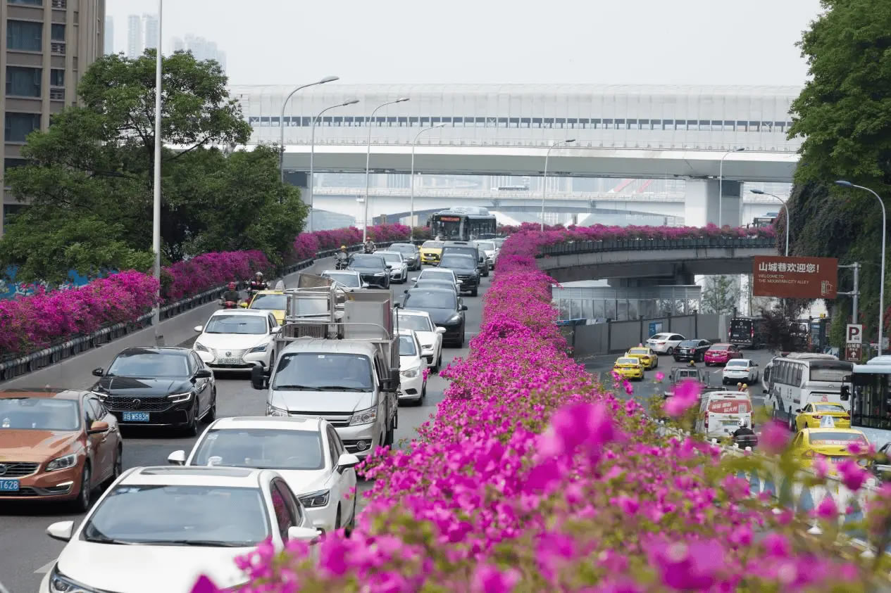 依托密集的立體交通網(wǎng)絡(luò),渝中區(qū)聚焦立交高架、人行天橋、軌道墩柱,打造四季有綠、全年可觀的路上風景線,賦予城市交通色彩與活力。渝中區(qū)充分利用中興路高架橋兩側(cè)空間,通過鋼結(jié)構(gòu)支撐,加掛耐修剪、易養(yǎng)護的三角梅花箱,形成500米空中花廊。
