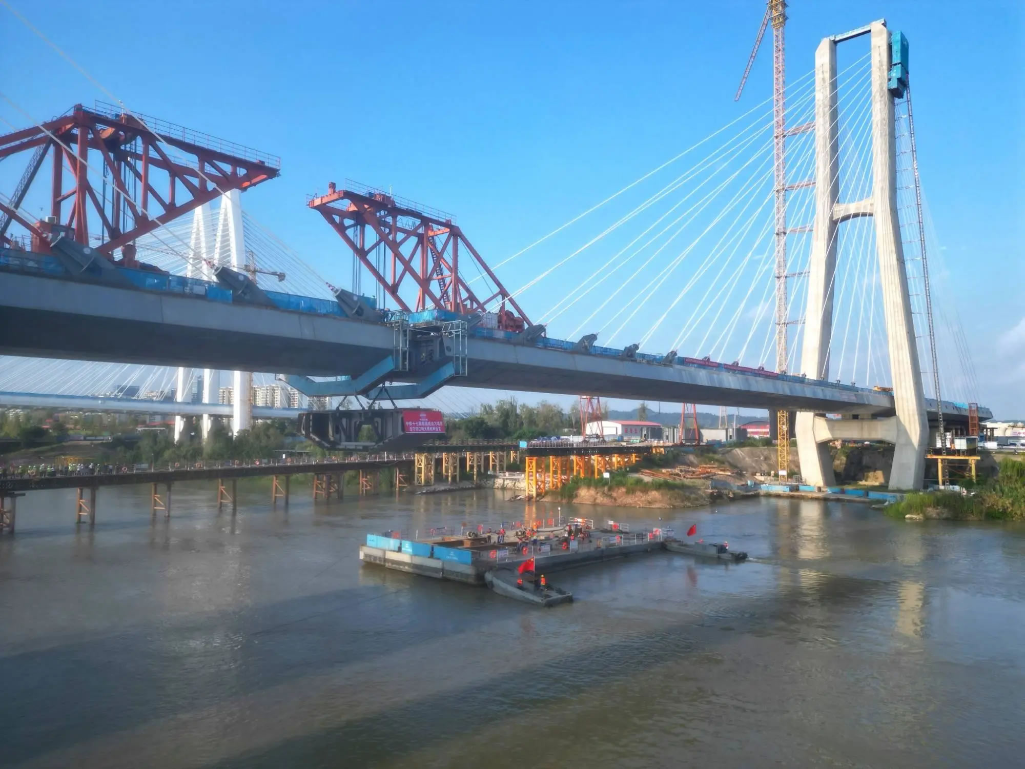據(jù)中鐵十七局成達(dá)萬高鐵項(xiàng)目二工區(qū)總工程師單立國介紹,由于大橋橫跨涪江,施工團(tuán)隊(duì)創(chuàng)新采用“浮運(yùn)+橋面吊裝”方案,先將鋼箱梁通過浮箱從碼頭運(yùn)輸至江心指定位置,再運(yùn)用150噸橋面吊機(jī)進(jìn)行精準(zhǔn)提升。為確保合龍精準(zhǔn)可控,項(xiàng)目團(tuán)隊(duì)提前謀劃、周密部署。針對大跨度斜拉橋合龍段受力復(fù)雜、溫度變形敏感、精度控制要求高等技術(shù)難點(diǎn),團(tuán)隊(duì)選擇夜間“溫度低、溫差小”時(shí)段進(jìn)行合龍,有效減少溫度變化引起的結(jié)構(gòu)變形,并通過線形監(jiān)控、勁性鎖定等關(guān)鍵技術(shù)措施,最終將線形精度控制在毫米級(jí)范圍,實(shí)現(xiàn)高質(zhì)量合龍。