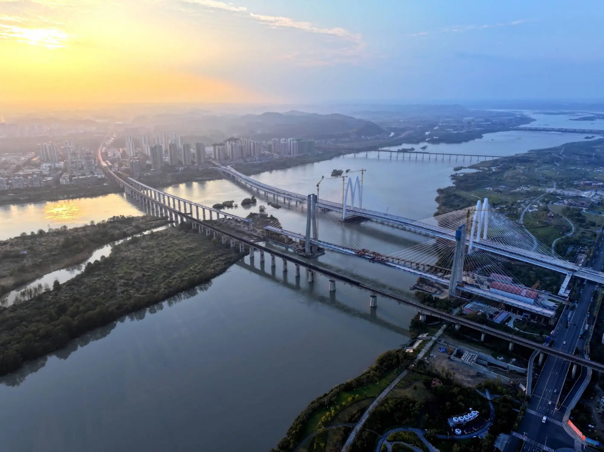 遂寧涪江特大橋位于四川省遂寧市船山區(qū)境內(nèi),是全線“3隧4橋”重難點(diǎn)控制性工程之一,大橋全長5585.4米。主橋?yàn)?ldquo;H”型特殊結(jié)構(gòu)雙塔雙索面鋼混結(jié)合梁斜拉橋,主跨長305米,是雙塔雙索面鋼混結(jié)合梁斜拉橋中主跨長度位居西南第一,全國第二的橋梁。兩座主塔分別高達(dá)118米和122米,梁面距離涪江江面25米。施工過程面臨工藝復(fù)雜多樣、高空作業(yè)安全風(fēng)險(xiǎn)高、大跨徑斜拉橋線形控制難度大等多重挑戰(zhàn)。
