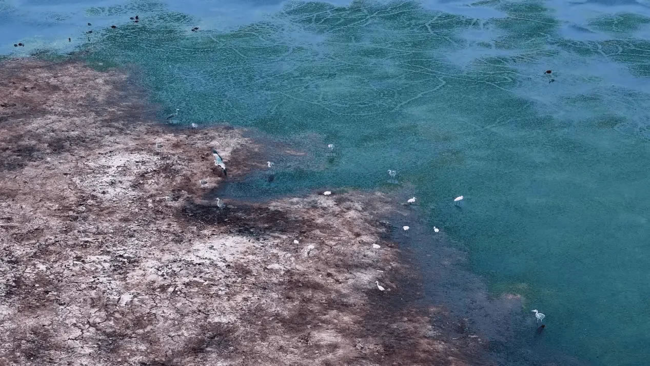 陽(yáng)光灑落時(shí),湖水清澈見(jiàn)底,魚(yú)兒在水中自在游弋,與岸邊景致構(gòu)成絕佳畫(huà)面。此外,黑翅長(zhǎng)腳鷸也不時(shí)現(xiàn)身灘涂,為這幅生態(tài)圖景再添一抹靈動(dòng)色彩。