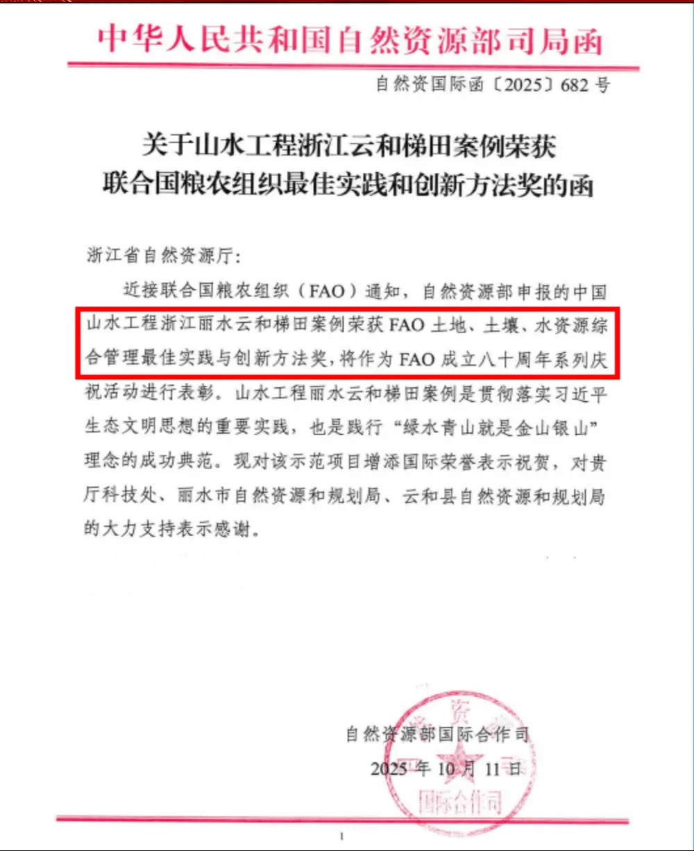近日,中國山水工程浙江云和梯田項(xiàng)目榮獲聯(lián)合國糧農(nóng)組織最佳實(shí)踐和創(chuàng)新方法獎(jiǎng),并將作為聯(lián)合國糧農(nóng)組織(FAO)成立八十周年系列慶;顒(dòng)進(jìn)行表彰。
