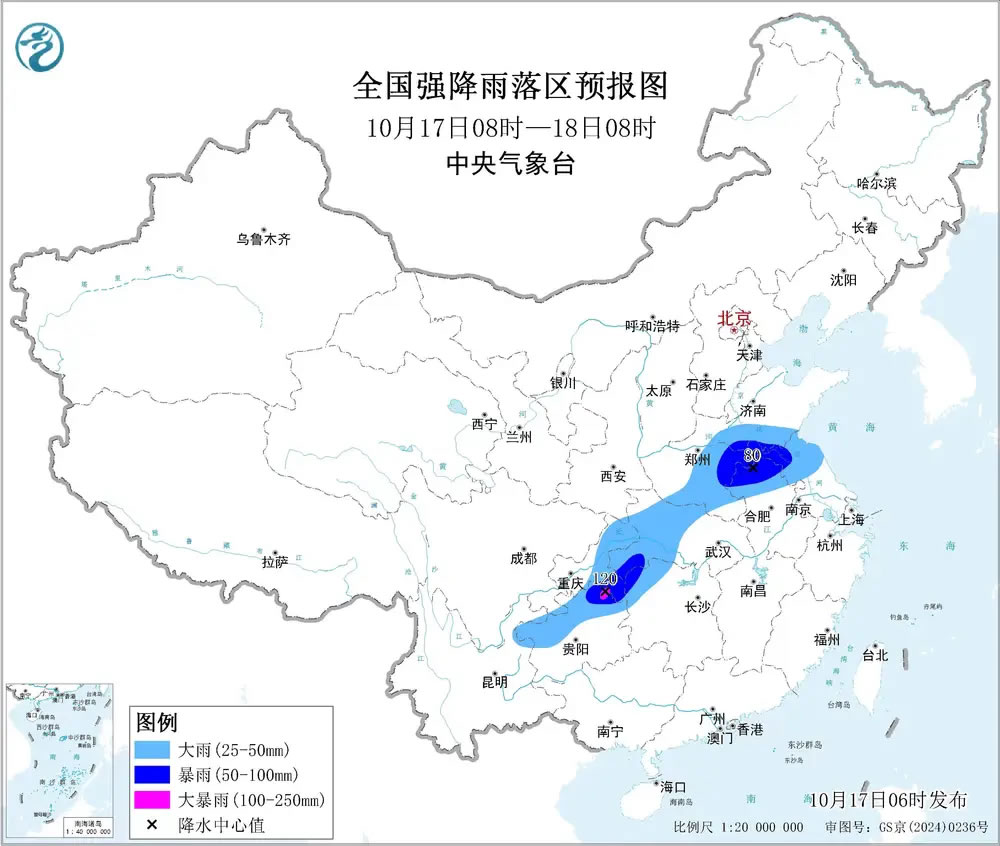 預(yù)計(jì),10月17日8時(shí)至18日8時(shí),重慶東部和北部、湖北中西部、河南中東部、山東南部、安徽北部、江蘇北部、湖南西北部、貴州西部和北部等地部分地區(qū)有大到暴雨,其中,重慶東南部、貴州東北部等地局地有大暴雨(100~120毫米)。上述部分地區(qū)伴有短時(shí)強(qiáng)降水(最大小時(shí)降雨量20~40毫米,局地可超過(guò)50毫米),局地有雷暴大風(fēng)等強(qiáng)對(duì)流天氣。