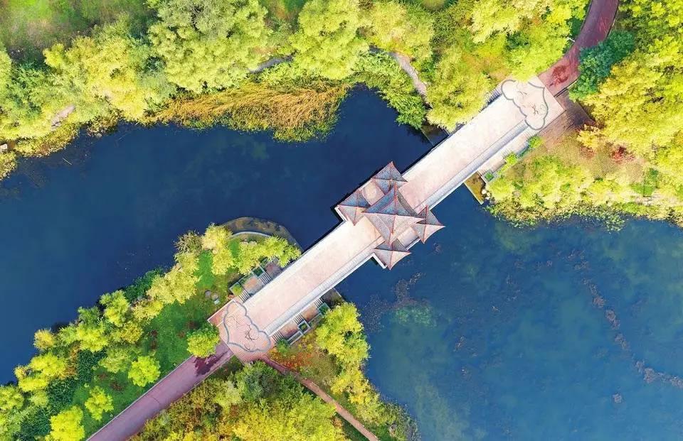 10月25日拍攝的臨汾市汾河文化生態(tài)景區(qū)。景區(qū)內波光粼粼,水草搖曳,疊翠流金。近年來,當?shù)赝ㄟ^建設城市公園,綠化美化城市空間,實現(xiàn)開門見綠、推窗見景。(記者 李現(xiàn)。