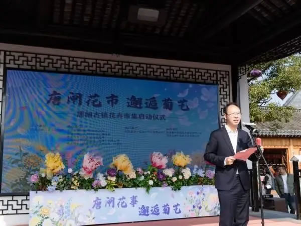 花卉市集啟動(dòng)儀式在北市景區(qū)暢音臺(tái)舉行,隨著干冰緩緩注入舞臺(tái)中央的“花蕊”裝置,瞬間巨型花朵在秋日陽(yáng)光下盛開,這一“干冰澆筑花開臺(tái)”的創(chuàng)意設(shè)計(jì),不僅象征著唐閘古鎮(zhèn)花卉市集的蓬勃生機(jī),更寓意著傳統(tǒng)與現(xiàn)代、文化與消費(fèi)的深度融合。啟動(dòng)儀式后,國(guó)風(fēng)舞蹈《簪花》率先登場(chǎng),舞者們身著漢服,手持鮮花,以柔美的舞姿演繹出“人面桃花相映紅”的古典意境,贏得現(xiàn)場(chǎng)觀眾陣陣掌聲。隨后,樂隊(duì)表演、花藝展示、非遺手作等環(huán)節(jié)輪番上演,將市集氛圍推向高潮。據(jù)初步統(tǒng)計(jì),開市首日吸引游客超1.5萬(wàn)人次。