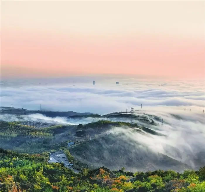 清晨6時(shí)許,市民高勁鵬與朋友驅(qū)車前往西山萬畝生態(tài)園。沿途霧氣彌漫,山路蜿蜒間,紅黃綠相間的植被頻頻躍入眼簾,偶有靈動(dòng)的松鼠從山路旁躥出又疾速消失在馬路對面,遠(yuǎn)處山巒影影綽綽,“人在畫中游”的韻味十足。汽車快抵達(dá)山頂時(shí),眼前的濃霧突然消散,淡藍(lán)色天空下,云海如流水般在城市上空鋪開。遠(yuǎn)處,云層翻涌似海浪;近處,沿山霧帶若玉帶流動(dòng),高壓電線塔頂端與零星高樓在霧中時(shí)隱時(shí)現(xiàn)。