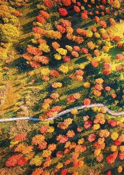 清晨,霧氣氤氳,成片的池杉樹在水中矗立。初冬時(shí)節(jié),池杉湖國家濕地公園層林盡染,眾多鳥兒從北方飛回,吸引眾多游客前來觀賞。