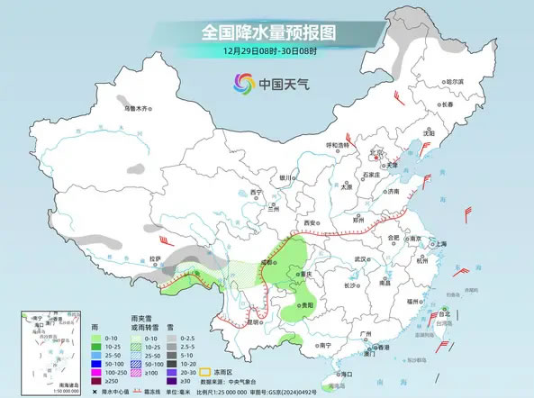2025年12月30日至2026年1月1日,西藏東部、西北地區(qū)東部、黃淮西部、江漢西部等地部分地區(qū)將有一次明顯雨雪天氣過程,陜西、山西、河南等地部分地區(qū)雨雪混雜。雨雪天氣或影響元旦假期出行,公眾外出需關(guān)注預(yù)警預(yù)報(bào)信息,駕車出行留出安全剎車距離,謹(jǐn)防道路濕滑。