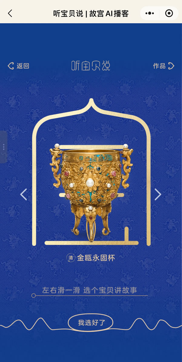 在故宮博物院建院100周年的尾聲,“聽寶貝說”為家長和孩子們呈上一份聲音禮物,通過個性化生成的AI播客,將文物故事轉(zhuǎn)化為視聽語言。那些來自千百年前的珍貴文物,仿佛穿越時空,來到孩子身邊,開始一場“寶貝”與“寶貝”間的聲音互動。部分文物來自故宮博物院常設(shè)展館,聽完還可以線下打卡,近距離欣賞文物“寶貝”。