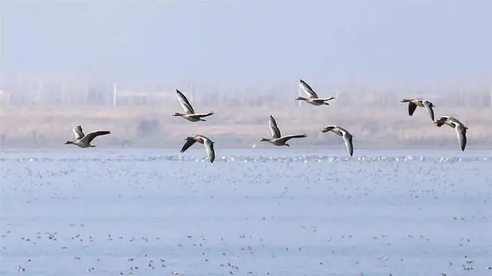 在沉湖濕地自由飛行的灰雁小分隊(duì) 通訊員顏軍攝