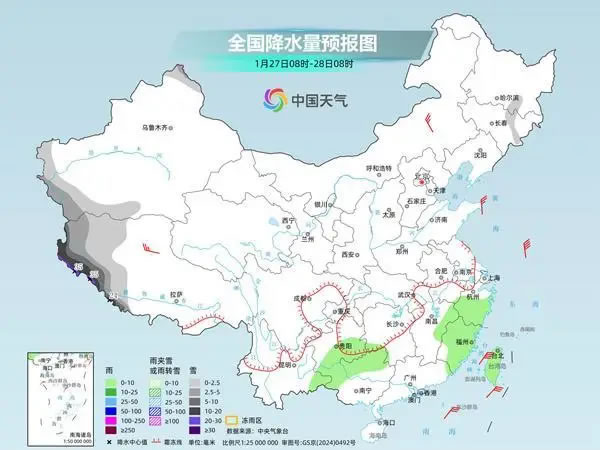 具體來看,中央氣象臺預(yù)計,今天,新疆北疆北部和南疆盆地西部、西藏西部和南部等地部分地區(qū)有中到大雪,其中,西藏西部和南部等地部分地區(qū)有暴雪到大暴雪,局地特大暴雪。湖南南部、江西中北部、浙江大部、福建大部、貴州中南部、云南東南部、廣西西部和東北部、臺灣島等地部分地區(qū)有小雨。
