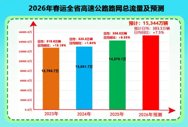 2026年春運(yùn)將于2月2日開始,3月13日結(jié)束,共計(jì)40天。春節(jié)假期小型客車免費(fèi)通行時(shí)間為2月15日至2月23日。省高速公路路網(wǎng)運(yùn)行監(jiān)測(cè)指揮中心研判,春運(yùn)40天全省高速公路出入口總流量將達(dá)到15344萬(wàn)輛,較2025年春運(yùn)增長(zhǎng)7.5%;日均流量383.5萬(wàn)輛,為平日流量的1.6倍,車流總量有望創(chuàng)歷史新高。