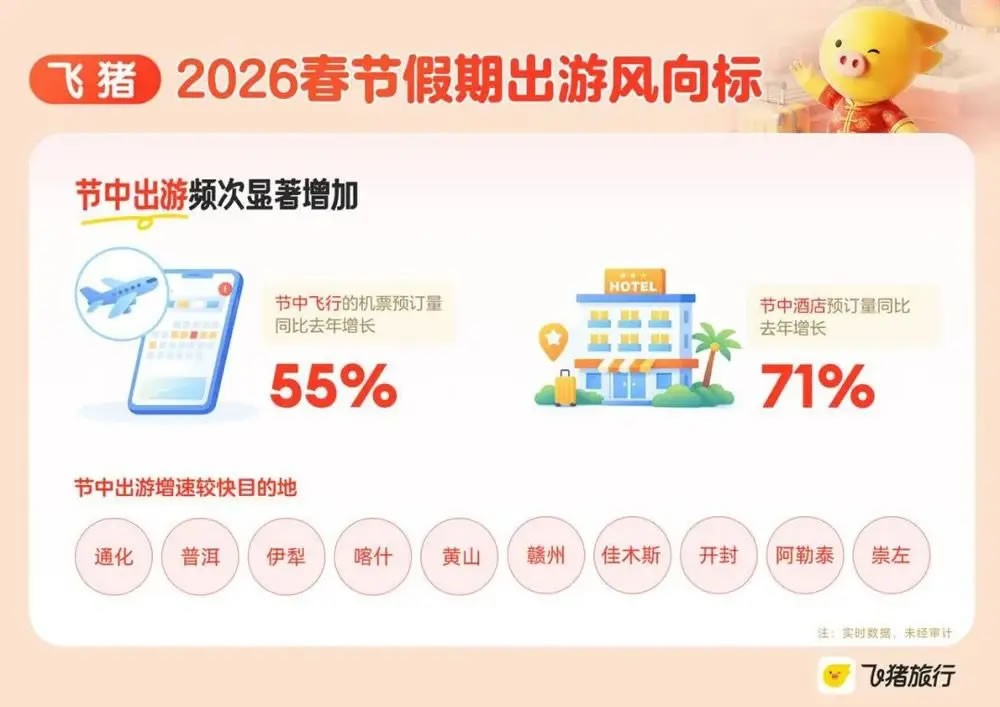 游客節(jié)中最愛去哪里?據(jù)飛豬觀察,長線的“3小時飛行圈”和短線的“2小時自駕圈”特征明顯,前者集中于一二線城市周邊300公里內(nèi)的寶藏小城,后者集中于西南、西北、東北等典型的旅游城市。從目的地來看,通化、普洱、伊犁、喀什、黃山、贛州、佳木斯、開封、阿勒泰、崇左等城市的節(jié)中出游預(yù)訂增速較快。