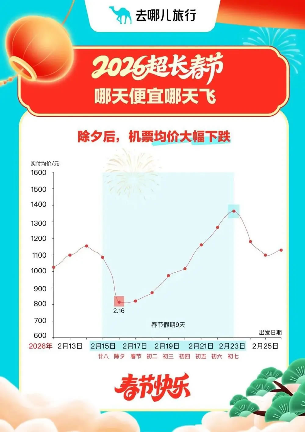 另據(jù)去哪兒旅行大數(shù)據(jù),進(jìn)入2月9日(農(nóng)歷臘月二十二)節(jié)前一周,預(yù)訂機(jī)票出行的旅客量就開始逐日增加,到2月14日(二十七)達(dá)到節(jié)前高峰。機(jī)票價格則跟出行量成正比,到2月15日(二十八)春節(jié)假期第一天,機(jī)票價格開始回落,2月16日(二十九,即除夕)降至節(jié)日期間最低點(diǎn),17日-19日機(jī)票價格都相對劃算。
