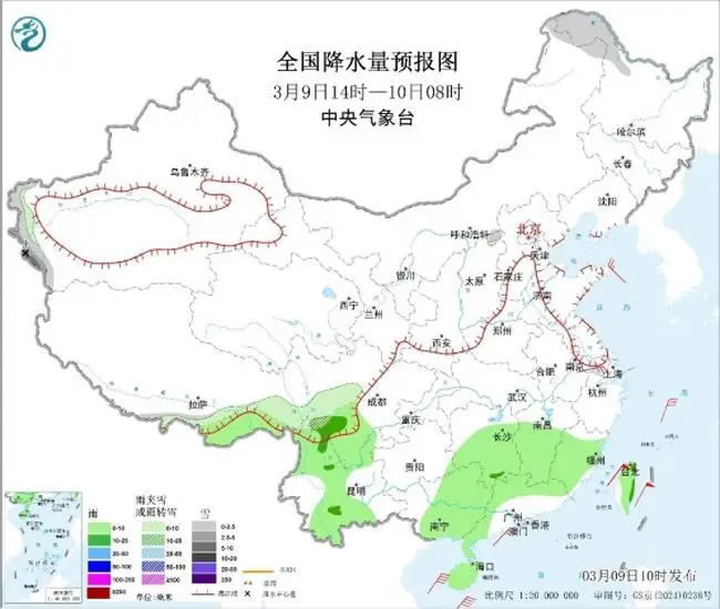 圖1全國降水量預(yù)報圖 (3月9日14時-10日08時)