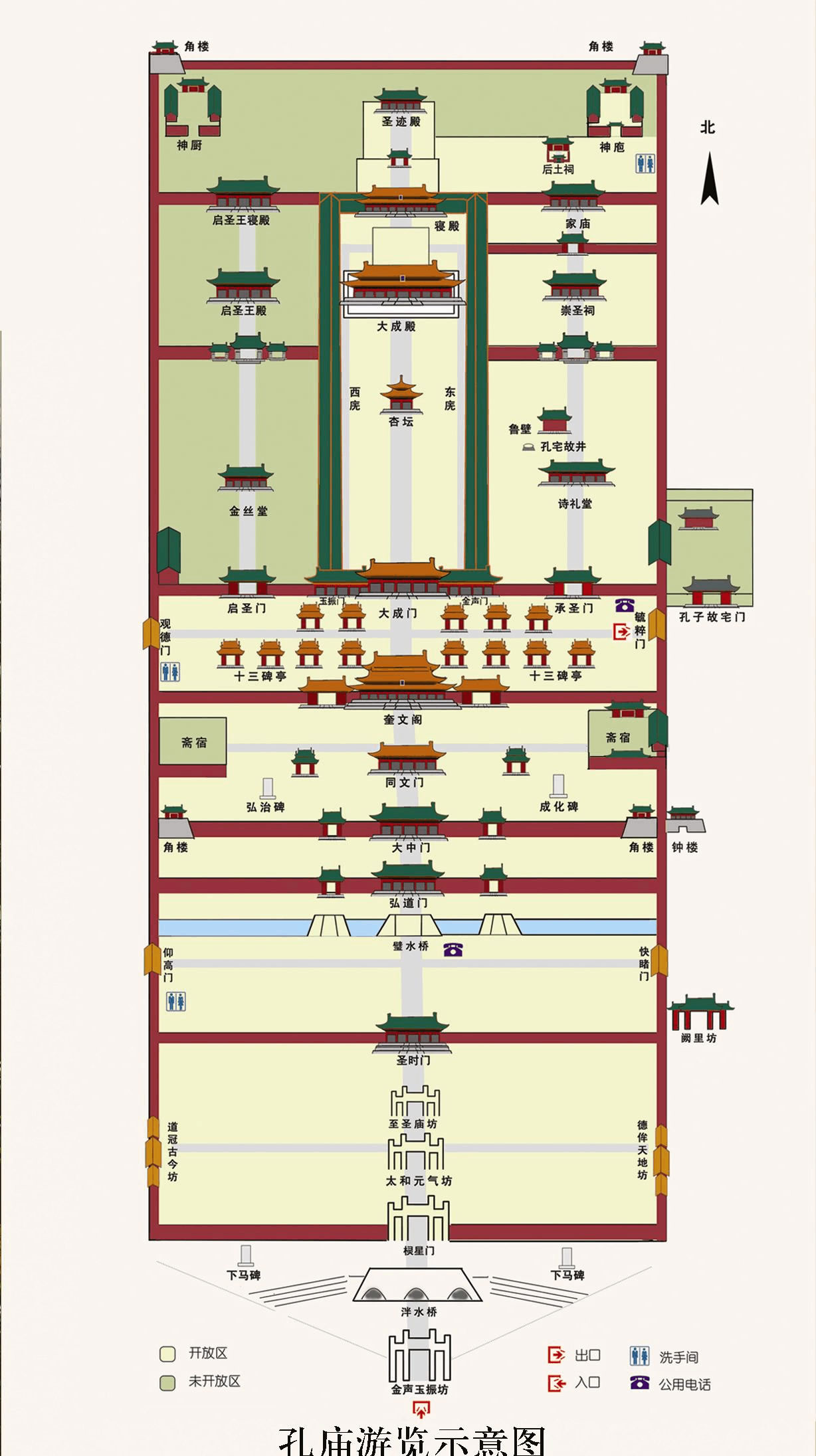 欞星門里建二坊,南為太和元?dú)夥唬朔唤ㄓ诿骷尉付辏ü?544年)春,形制與金聲玉振坊同,坊額題字系山東巡撫曾銑手書,贊頌孔子思想如同天地生育萬物一樣。北為至圣廟坊,明額題刻篆字,坊明代時(shí)原刻“宣圣廟”3字,清雍正七年(公元1729年)易為今名。坊為漢白玉石刻制,三間四柱,柱飾祥云,額坊上飾火焰寶珠。