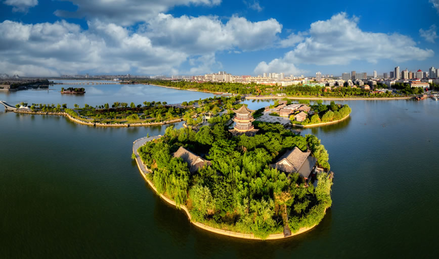 國家4A級(jí)旅游區(qū)、山東省重點(diǎn)服務(wù)業(yè)園區(qū)、山東省生態(tài)漁業(yè)示范園、國家垂釣基地,也是“江北水城·運(yùn)河古都——生態(tài)聊城”城市品牌的核心區(qū)域。位于聊城市中心城區(qū),由10個(gè)湖區(qū)和20塊水面組成,總面積6.3平方千米,湖岸線長達(dá)16千米,有“南有西子,北有東昌”之美譽(yù),是中國江北地區(qū)罕見的大型城內(nèi)湖泊。東昌湖湖始于北宋熙寧三年(1070年),水深平均達(dá)3米,最深處5米。水質(zhì)清澈,景色宜人,適宜水上游樂項(xiàng)目的開發(fā)與建設(shè)。