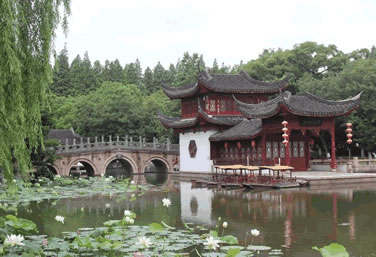紫菱洲為賈赦之女賈迎春的居所,因她在海棠詩社中號“菱洲”。這是兩座相同式樣的建筑,中間以七曲橋連接,兩端各有三曲橋。漲水時,曲橋平臥。