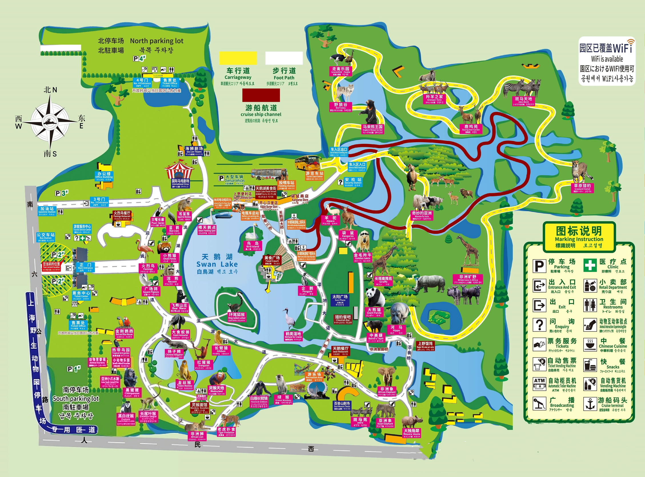 上海野生動物園現有車入區(qū)、步行區(qū)兩大區(qū)域。車入區(qū)分布著奇妙的亞洲、非洲曠野、優(yōu)雅長頸鹿、最美閃電俠、草原霸主、荒野大力熊、森林之王、白虎領地、野狼谷、馬來熊王國10大主題區(qū)域。步行區(qū)則分布著大熊貓館、鶴類濕地、火烈鳥展區(qū)、企鵝館、天鵝湖、羊駝苑、紅猩猩館、中美貘館、小動物樂園、鸚鵡館、河馬館、白眉長臂猿展區(qū)、大食蟻獸展區(qū)、鱷魚島、狐猴島、浣熊展區(qū)、金絲猴島、飛熊山莊、綠猴區(qū)、白虎展區(qū)、松鼠猴、小熊貓區(qū)、黑猩猩館、袋鼠坡、長頸鹿雅苑、亞洲象展區(qū)、金毛羚牛館、國禮非洲獅展區(qū)、熱帶鳥園、斑馬苑、非洲象展區(qū)、老虎撲食區(qū)、白頰長臂猿島、藍鶴、大獨角犀、大嘴長廊、靈猴天地、亞洲小爪水獺展區(qū)、太陽廣場共39個館區(qū)。