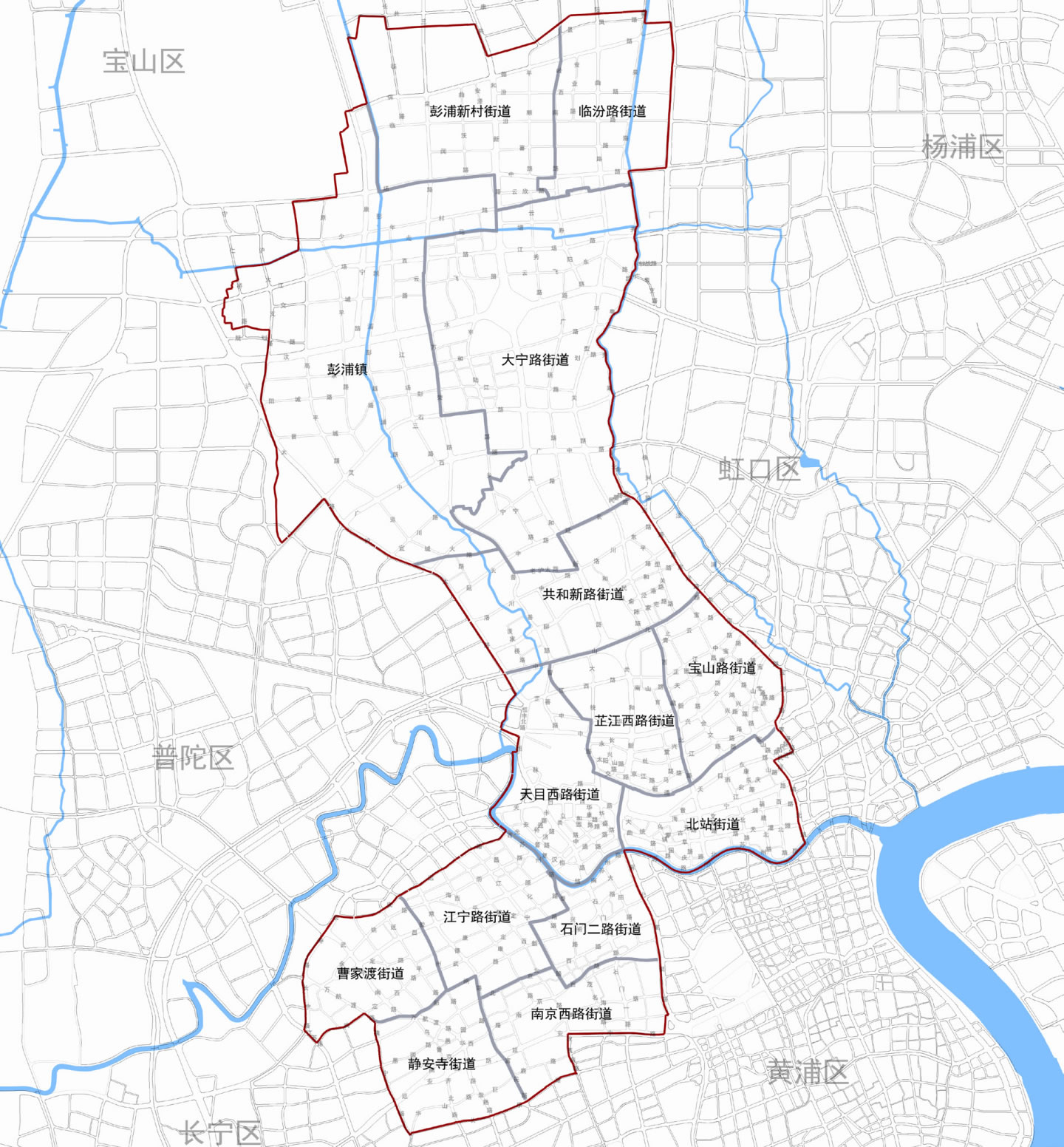 街道:靜安寺街道、曹家渡街道、江寧路街道、石門(mén)二路街道、南京西路街道、天目西路街道、北站街道、寶山路街道、芷江西路街道、共和新路街道、大寧路街道、彭浦新村街道、臨汾路街道