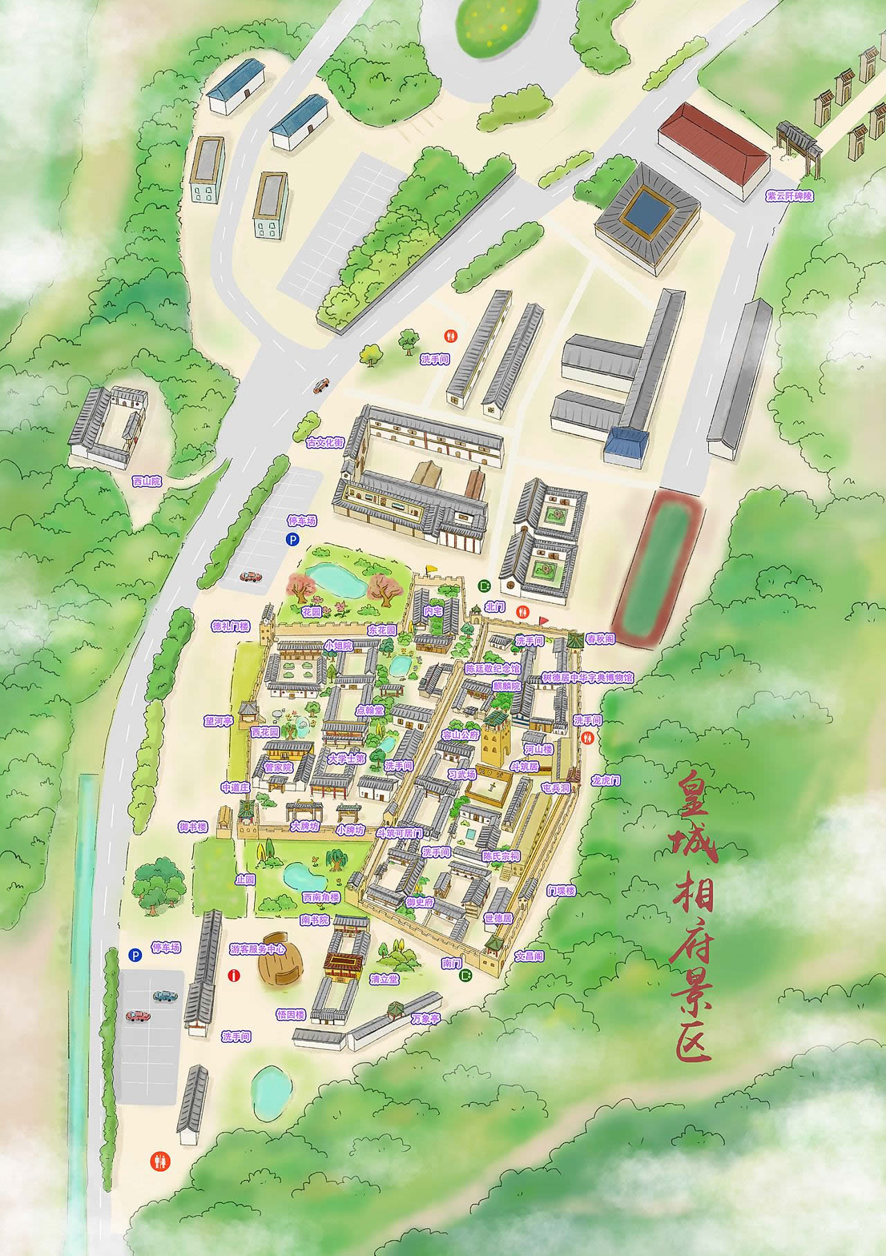皇城相府建筑群分內城、外城兩部分,有院落16座,房屋640間,總面積36580平方米。內午亭山莊導航圖城始建于明崇禎五年(公元1632年),有大型院落八座。外城完工于康熙四十二年(公元1703年),有前堂后寢、左右內府、書院、花園、閨樓、管家院、望河亭等。