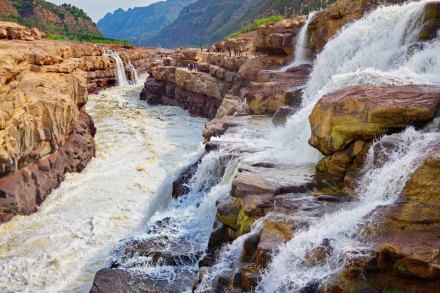 在高處河岸上,幾乎是看不到“龍槽”和黃河水流,只能看到紫褐色基巖河床中一線急騰翻卷的黃濁水塵和聽到轟鳴不息的奔騰濤聲。這槽中激流就象一鍋滾沸的水,左奔右奪,奔騰翻滾急下,激起的水霧彌漫在龍槽之上,使黃河在這里變得朦朦朧朧。每逢汛期黃河水漲時(shí),洪水溢出壺口龍槽一端,龍槽東岸會(huì)出現(xiàn)一道一、二千米長(zhǎng)的漫流水簾,十分壯觀。遠(yuǎn)望龍槽,彎彎曲曲的峽中石槽,活象一條搖頭擺尾的巨龍,壺口是龍頭,一口吞沒黃河巨流。孟門是龍尾,腹泄河水于下游。