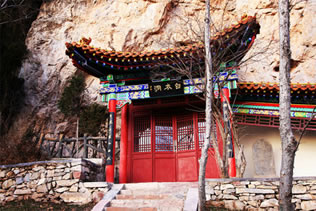 龍王洞在天竺寺景區(qū),位于石膏山上巖溶洞之東側(cè),洞高5米,寬8米,深10米許,洞內(nèi)建龍王祠。龍王祠面闊一間。洞前辟有四級(jí)平臺(tái),紅條石漫地,松柏間植,環(huán)境幽雅。洞東通一小洞,深不可測(cè),洞口壁上有赭紅字跡“龍水宮”;洞內(nèi)泉水汩汩而出,清澈異常。洞外崖壁石縫間平生一株山桃,主桿直徑不過(guò)10厘米,貼地生出百十根分枝,呈扇面狀!吧让妗庇3米多長(zhǎng)、2米多寬。每逢陽(yáng)春三月,滿樹桃花盛開,有如鳳凰展翅。這就是石膏山古景之一的“龍鳳呈祥”。 |