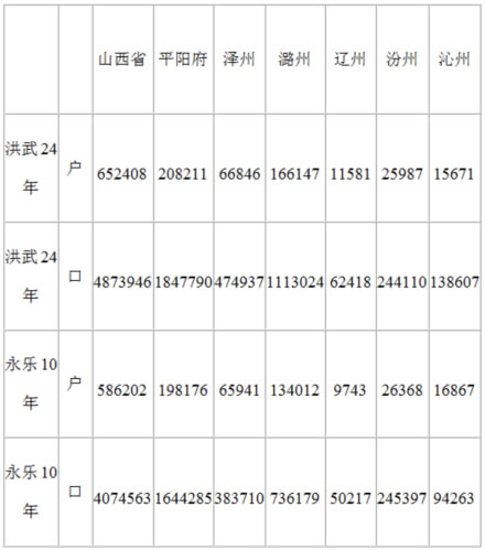 據(jù)《山西通志》記載,洪武元年(1368年)到永樂十五年(1417年),被移之民以晉南為多,其次為晉東南、晉中數(shù)縣。明代初年,山西省轄5府、3直隸州、16散州、79縣。史書記載的明初移民主要有平陽府轄的28縣,潞安府轄的8縣,汾州府轄的7縣,澤州轄的4縣,沁州簿的2縣,遼州轄的2縣。這些地區(qū)共有51縣,而平陽府就轄28縣。