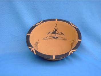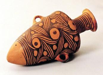 繪畫圖案古樸、簡練,可分三大類:一類為象生性圖案,如張口作吞食狀的魚、悠閑的鹿、搜索食物的蛙等動物紋,還有植物紋。這些象生圖案同史前人類的生活息息相關(guān),形態(tài)生動的動植物紋樣是農(nóng)耕和漁獵生活的反映。第二類為幾何圖案,有三角形,方格紋、編織紋等,這類圖案多在缽、罐、盆、壺類器皿外璧上部,許多缽類器口緣外側(cè)繪黑色寬帶紋,部分大口淺腹器皿的彩陶圖案多繪在內(nèi)壁上,小口器的圖案則繪在口唇和肩腹部,這些部位多是容易看得見的地方,多數(shù)圖案清晰,筆畫疏朗,這些幾何圖案中,三角紋是由魚紋圖案變化而來,波折紋則是山或水的寫意。