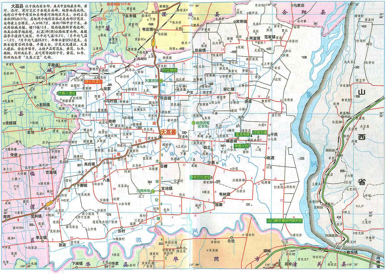大荔縣位于關(guān)中平原東部,是黃 、洛、渭三河匯流之地。南界渭河與潼關(guān)、華陰、華縣為鄰,西繞洛河與蒲城、臨渭區(qū)毗連,北沿臺塬與澄城、合陽縣接壤,東瀕黃河與山西永濟相望,素有"三秦通衢"、"三輔重鎮(zhèn)"之稱。大荔縣總面積為1776.1平方公里,全縣轄7鎮(zhèn)26鄉(xiāng),414個行政村??cè)丝?2萬人。