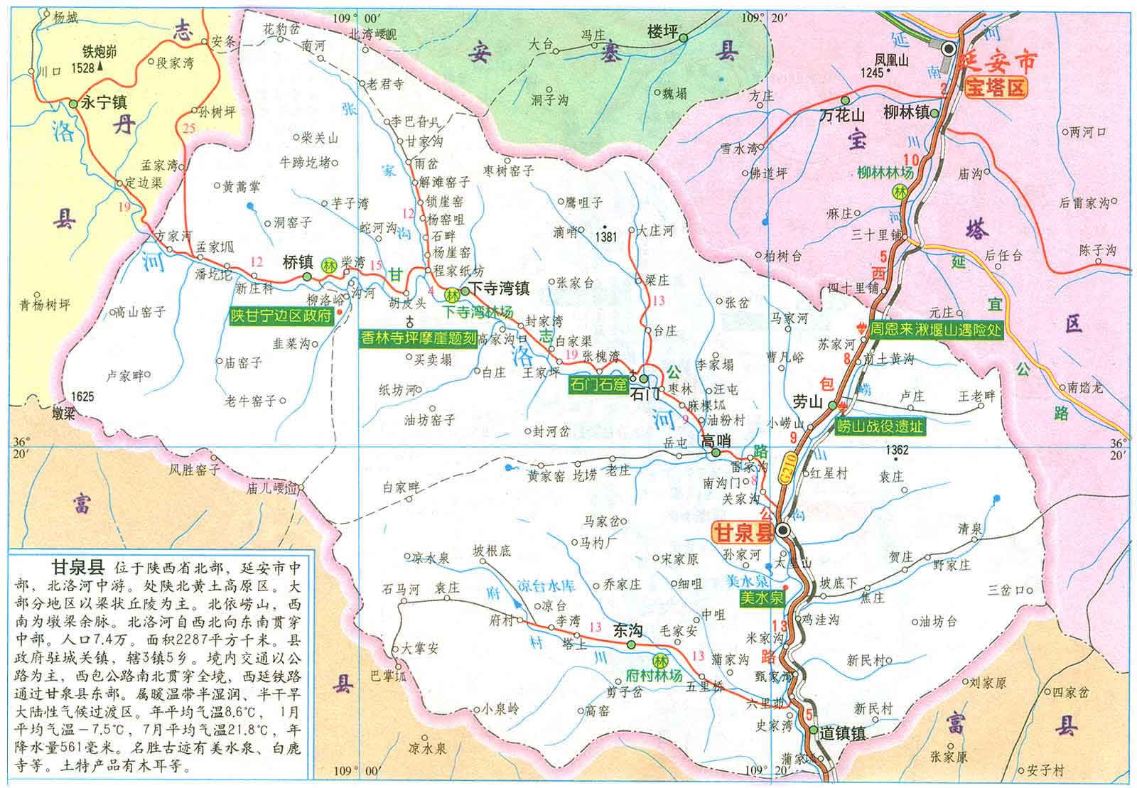 甘泉縣地處陜西省延安市中部,總?cè)丝?3507人,其中農(nóng)業(yè)人口53600人,總面積2284.7平方公里。210國道、西延鐵路和即將開工建設(shè)的黃陵-延安高速公路穿境而過,交通十分便利。