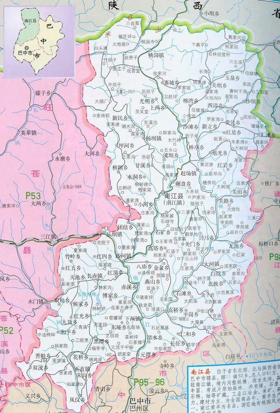 南江縣位于四川北緣米倉山南麓,東鄰?fù)ń辖影椭,西界旺蒼,北靠陜西省南鄭縣。南江古屬巴國,后為集州,先秦兩漢就有政區(qū)建置。南北朝時期的梁普通六年(公元525年)始建難江縣(取江水難涉之意),距今1480年,明正德十一年(公元1516年)改難江縣為南江縣(江水繞城南而名)至今。 幅員面積3383平方公里,有耕地42.3萬畝;總?cè)丝?5萬人,總戶數(shù)20.2萬戶。全縣轄48個鄉(xiāng)鎮(zhèn),522個村,2408個村民小組,86個居民委員會。