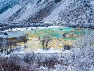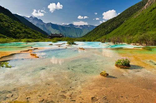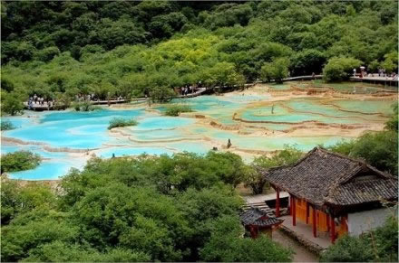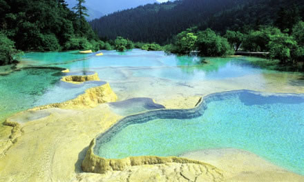 進入黃龍景區(qū),首先看到的是一組精巧別致、水質(zhì)明麗的池群--迎賓池。池子大小不一,形狀奇特,色彩艷麗,錯落有致,四周山岳環(huán)峙,林木蔥蘢,山間野花競放,彩蝶飛舞。山間石徑曲折盤旋,點綴著觀景亭閣,倍添情趣。