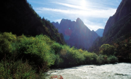 丹云峽以俊秀印峽谷風(fēng)光,成為黃龍的“五絕”之一。它擁有豐富的樹種、灌木和花草,是植物愛好者的天堂。丹云峽景區(qū)起子玉筍群峰,止于扇子洞,綿延18.5公里,落差1300米,峰谷高差為1000至2000米。這里冬天一片雪白,夏天山林翠綠,尤其是春天漫山遍野的紅杜鵑、秋天一路楓葉紅遍峽谷,那情景仿佛夕陽之下的火燒云從天而降,丹云峽因此而得名。山生云,樹生風(fēng),丹云峽幾乎每天都有云霧從林中升起,繚繞山間,時隱時現(xiàn)。丹云峽內(nèi)森林密布,發(fā)源于雪寶頂?shù)母⒔,在峽內(nèi)奇石怪巖的夾逼中奔游林間,好似一條白龍搖頭擺尾,與身邊的黃龍遙相呼應(yīng)。
