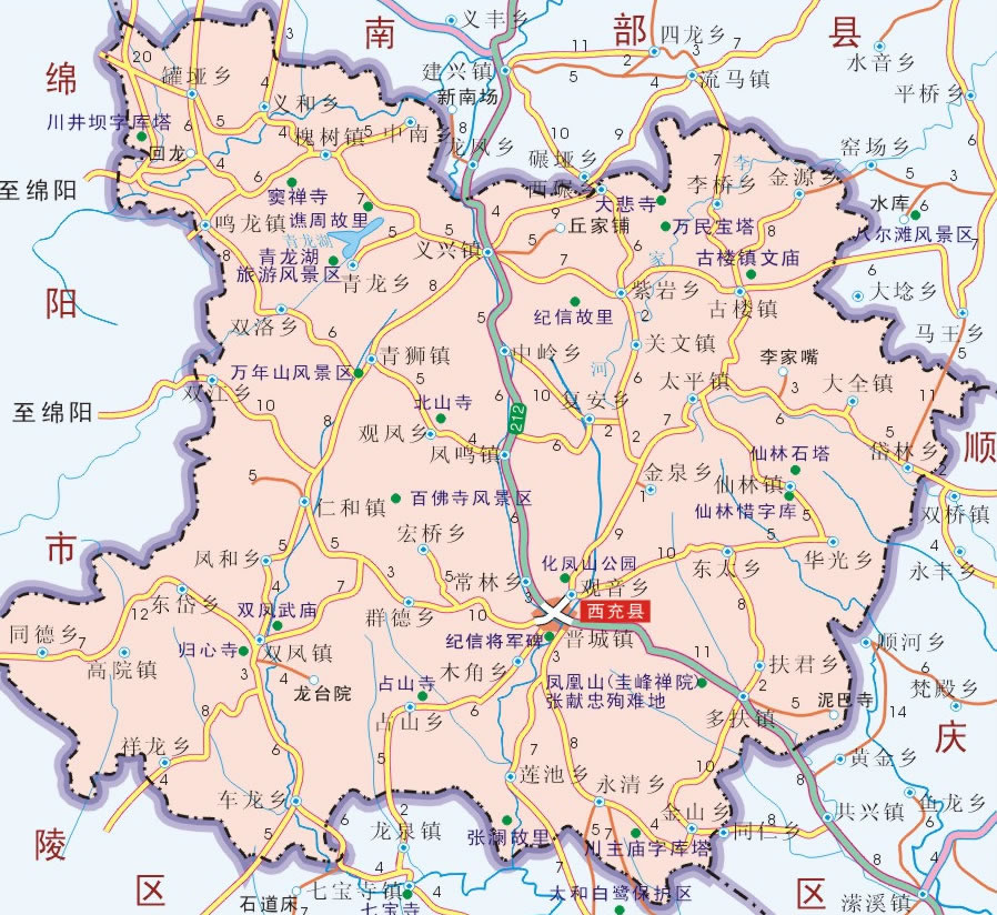 高速公路 廣南高速公路:廣元——西充——南充;成巴高速公路:成都——中江——三臺(tái)——鹽亭——西充——南部——儀隴——巴中;南綿高速公路:南充——西充——鹽亭——綿陽(yáng);遂巴高速公路:遂寧——西充——巴中