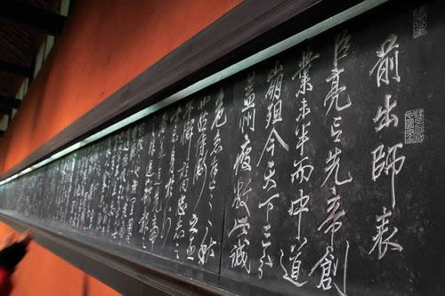 諸葛亮殿的東西廂是書屋、客室,鐘樓、鼓樓峙立大殿二角。諸葛亮殿內(nèi)供祀著諸葛亮的貼金泥塑坐像,左側(cè)是諸葛亮之子諸葛瞻,右側(cè)是諸葛亮的孫子諸葛尚。塑像前有銅鼓三面,鑄于公元六世紀(jì)之前,傳說是南征夷蠻時(shí)所用。大殿后壁嵌有許多石刻,東壁是當(dāng)代書法家沈尹默書寫的諸葛亮 《隆中對(duì)》 ,表達(dá)的是“三顧頻繁天下計(jì),兩朝開濟(jì)老臣心”的壯志雄心;西壁則是宋代名將、“精忠報(bào)國(guó)”的民族英雄岳飛所書的諸葛亮 《出師表》 ,“鞠躬盡瘁,死而后已”名句傳誦千古,忠誠(chéng)執(zhí)著的浩然正氣氣貫長(zhǎng)虹。殿內(nèi)外匾對(duì)甚多,都是對(duì)諸葛亮的謳歌和追思。