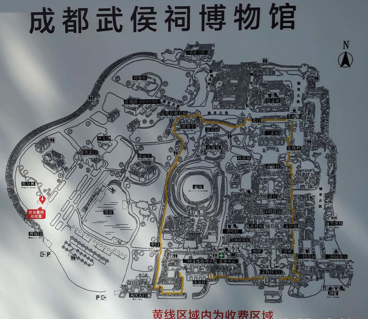 成都武侯祠博物館現(xiàn)分為三國(guó)歷史遺跡區(qū)(文物區(qū))、西區(qū)(三國(guó)文化體驗(yàn)區(qū))、錦里民俗區(qū)(錦里)三大板塊,面積15萬平方米。整個(gè)武侯祠坐北朝南,占地面積五十六畝(37000平方米),祠內(nèi)翠柏森森,殿宇重重,布局嚴(yán)謹(jǐn),莊嚴(yán)肅穆。成都武侯祠主體建筑大門,二門,劉備殿,過廳,武侯祠五重,嚴(yán)格排列在從南到北的一條中軸線上,西側(cè)是劉備陵園及其建筑。二門至劉備殿與東西殿、過廳至諸葛亮殿與東西兩廂房,形成兩組四合建筑結(jié)構(gòu)。軸線建筑兩側(cè)配有園林景點(diǎn)和附屬建筑。 跨進(jìn)漢昭烈廟,從大門到二門之間可見六通石碑聳立一道路。