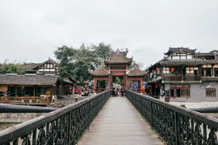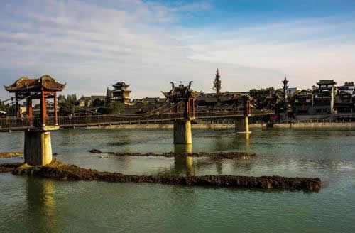 元通古鎮(zhèn)三面環(huán)水,一面環(huán)山。千百年來,滾滾江水滋潤著這方神圣的土地。江岸之外良田萬頃,古鎮(zhèn)街頭院落森森。大小不一的街巷保存完好,木板房、青瓦房相連成片,遺存至今的古老民居,泱泱然散發(fā)著濃濃的古韻,挪動著每一寸腳步,推開每一扇窗欞,似乎都闖開了歷史的大門自己也便,情不自禁、身不由己地也便走進了過去,走進了歷史。走進元通深處,一幢幢民房,一條條街巷,摸著這歷史的邊邊角角,終于找到了心靈的歸宿。元通古鎮(zhèn)依山傍水一路修來,鎮(zhèn)上的主要建筑都沿文井江拔地而起,上千戶人家臨河而居,水是他們的寄托,水是他們的立命之本,水與這里的人結(jié)下了不解之緣。所以,生活在這里的居民,家家的后院里都有石階可以下到河邊。古時,鎮(zhèn)上的人出行大都靠水遠,家家戶戶都順著后門的石階進進出出,那情形有如走進了以一處江南水鄉(xiāng)。在江河之上,一道鐵橋?qū)⒐沛?zhèn)與外灘緊緊地連在一起,時疏時密的鄉(xiāng)民在橋上來來去去,如履平地。這座橋名叫匯江橋,全長164米、寬2、5米、高6米,造型古雅,除兩端橋樓,中間幾座帶歇山項的涼亭在寬闊的江面上頗顯風致,橋下是文錦江,味江和泊河江在元通的匯流之處,流床寬闊,水流湍急,極為有利于水上航運。據(jù)方志載,古運通航,元通堪以重任,從此起航,須經(jīng)白馬渡,陳家渡、方渡,再順著崇州境內(nèi)最大最長的河流――西河到新津龍王渡,然后進入岷江,這段30余公里的航道乃為崇山十分重要水上交通。正是通過這條航道,元通境內(nèi)的土特產(chǎn),才得以遠銷樂山、宜賓、瀘州等地,同時他們也從這條道上獲得了生活中的日用百貨,因元通是物流的集散地。同時,外地客商也多聚匯于此,于是元通市井繁榮,生意興隆,到清咸豐年間終成大鎮(zhèn)。匯江橋雖造型古雅,但是一座現(xiàn)代橋,其修建年代竟為1986年,據(jù)載,最早的鐵索橋建于清光緒年間,長達130余米,氣勢宏大壯觀,因晚清末年清明會時人多坍塌,其后人元通人又募資再建,造型如同今日,可惜毀于“文革”風暴,視橋為情感寄托的元通人,出于對歷史的情感顧念,再次集資修建了索橋。