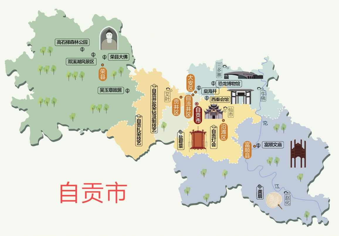 自貢市“因鹽設市”,“自、貢”兩個字是由“自流井”和“貢井”兩個鹽井名字合稱而來;是中國重要的恐龍化石產地,被稱為“恐龍之鄉(xiāng)”,以擁有世界三大恐龍博物館之一的自貢恐龍博物館而聞名于海內外;食鹽為百味之祖,植根于巴蜀文化,結胎于川菜系列,伴隨著鹽業(yè)經濟的繁榮與發(fā)展而形成的自貢鹽幫菜,成為有別于成渝兩地“上河幫”、“下河幫”菜系的川南“小河幫”代表,是全國首批老工業(yè)城市產業(yè)轉型升級示范區(qū)、國家新型工業(yè)化節(jié)能環(huán)保裝備制造示范基地,曾獲評“中國鹽幫菜之鄉(xiāng)”;有四川輕化工大學、四川衛(wèi)生康復職業(yè)學院和自貢職業(yè)技術學院三所高校。自貢有自貢恐龍博物館、仙市古鎮(zhèn)等A級旅游景區(qū)18個(其中,4A級景區(qū)7個)。