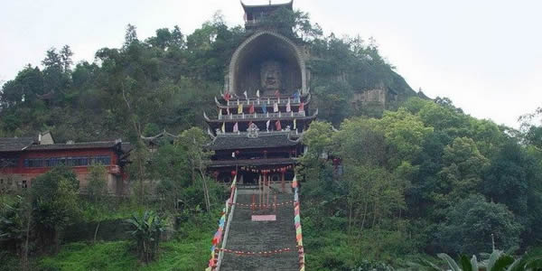 榮縣大佛:榮縣城東0.5公里有全國(guó)第二大佛——榮縣大佛,大佛寺內(nèi)半山之上,有一尊巍峨的石刻如來坐佛佛像,世稱榮縣大佛。大佛依山崖鑿成,通高36.67米,頭長(zhǎng)8.76米,肩寬12.67米,膝高12米,腳寬3.5米,其頭部長(zhǎng)8.76米,肩寬12.67米,腳寬3.5米。是一尊如來佛像,僅次于樂山彌勒大佛,為中國(guó)第二石刻大佛!s縣大佛開鑿于北宋元豐八年(公元1085年),完工于公元1092年,歷時(shí)八年始完工。大佛的頭頂上方有一道石條卷拱護(hù)罩,上刻“大開覺路”四字;崖頂上還有磚閣一座,遠(yuǎn)看像在戴在大佛頭頂上的寶冠!〈蠓痂徔掏旯ず,即修有殿宇保護(hù),根據(jù)《古今圖書集成》記載,時(shí)有“架殿十層,高四十七丈,闊十五丈”、“舊時(shí)寺門、抵今溪岸”。可見當(dāng)時(shí)的恢宏氣勢(shì),其后幾毀幾修,現(xiàn)存的殿宇為清代嘉慶、道光年間所建。1988年重建的大佛護(hù)身樓,是仿木仿古重檐歇山式建筑,既保護(hù)了大佛,又具游覽價(jià)值,逐層登樓近瞻佛容慈顏,從上到下盡觀大佛偉岸雄姿,鳥瞰榮城風(fēng)貌,眺望遠(yuǎn)山近巒。