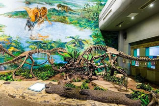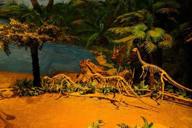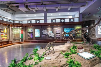 自自貢恐龍博物館的現(xiàn)有基本陳列“侏羅紀(jì)恐龍世界”,按照“恐龍世界——恐龍遺址——恐龍時(shí)代的動(dòng)植物——珍品廳——恐龍?jiān)佻F(xiàn)”順序展開,吸收現(xiàn)代陳列理念,采用場(chǎng)景式展示、擬人化組合,輔之以聲、光、電及多媒體等展示手段,展開了一幅蔚為壯觀、神奇瑰麗史前畫卷,再現(xiàn)了由恐龍及許多早已消失的物種構(gòu)成的神秘多姿的侏羅紀(jì)時(shí)代。同時(shí),還突出展示了博物館的精華—化石埋藏現(xiàn)場(chǎng),給人以強(qiáng)烈的視覺沖擊和心靈震撼,充分體現(xiàn)了專業(yè)博物館與遺址博物館的雙重特色。