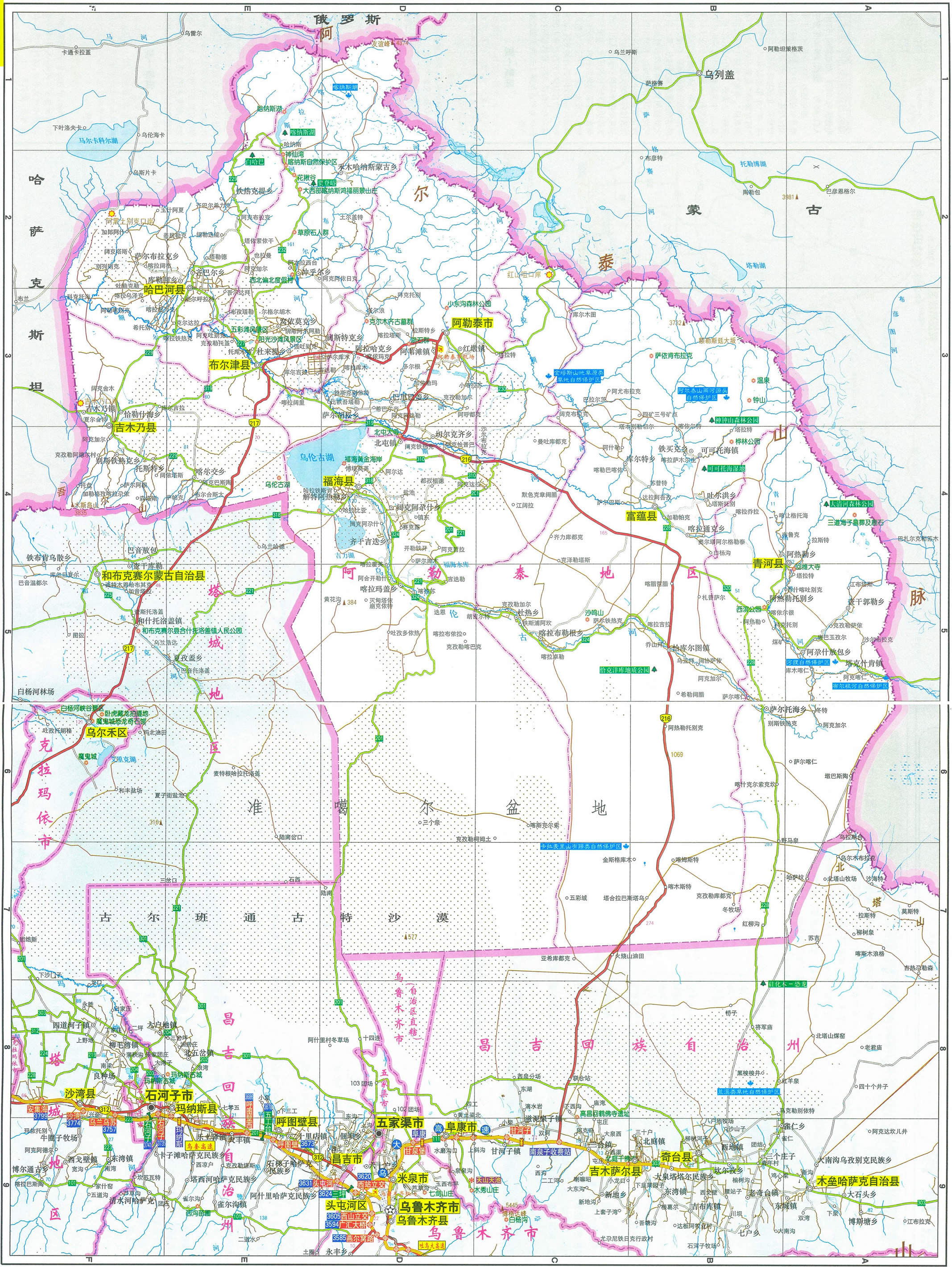 福海縣 面積32400平方千米,人口65041,政府駐福海鎮(zhèn),下轄3個(gè)鎮(zhèn)、3個(gè)鄉(xiāng)