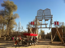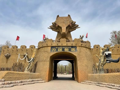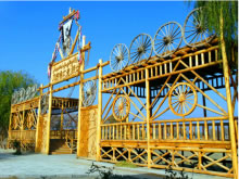 風(fēng)格獨(dú)特、氣勢(shì)宏偉的大門就是刀郎人民俗村寨門。造型似刀郎人英雄男兒形象,體現(xiàn)刀郎人的勇敢彪悍、不屈不撓、勤勞智慧、熱愛(ài)子民的硬漢精神。