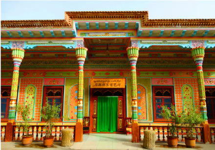 這座獨(dú)具刀郎人特色的大門,往上看可以看到是一個(gè)半圓,那是一個(gè)太陽(yáng)圖騰,因?yàn)榈独扇嗽谛叛鲆了固m教之前曾信仰過(guò)薩滿教,薩滿教有圖騰崇拜的習(xí)俗,所以這也是信仰薩滿教遺留下來(lái)的一種圖騰崇拜。中間有動(dòng)物頭飾,在這里掛動(dòng)物頭飾一方面是起個(gè)裝飾作用,另一方面辟邪,同時(shí)這些動(dòng)物頭飾也反映了刀郎人過(guò)去的游牧生涯。走進(jìn)這個(gè)大門時(shí)也是有講究的,中間的這個(gè)正門它是部落酋長(zhǎng)或者是部落里來(lái)了比較尊貴的客人走的,普通老百姓是從兩邊的側(cè)門走而且是男左女右這樣分開(kāi)來(lái)走的。