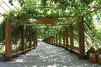 一是葡萄溝接待站。這是為中外賓客開辟的游覽場所,依山旁水,安靜、幽雅,景物天成,數(shù)條葡萄長廊深邃、幽靜,有的游客信步葡萄架下,仰首盡情觀嘗珍珠般的葡萄,有的游人坐在葡萄架下品嘗鮮葡萄。長廊盡頭碑石上葡萄溝三個(gè)鮮紅大字,格外引人注目,游人爭先恐后在此照相留念。園內(nèi)有民族風(fēng)味的食堂,有賣工藝品的蒙古包,還有劃船游玩的地方。